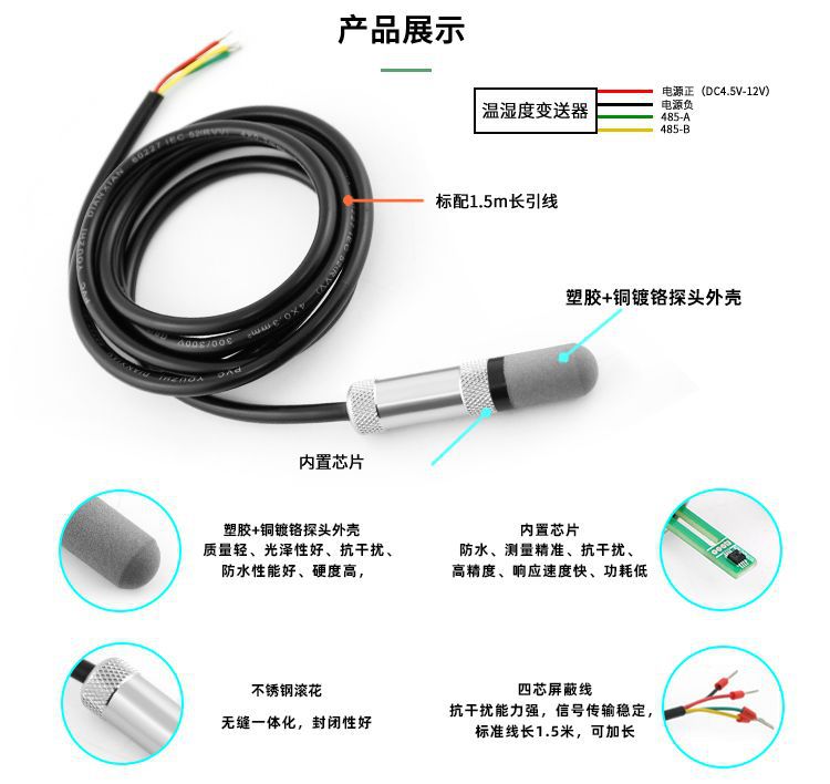 RS485一體溫濕度變送器采用進口RHT系列溫濕度傳感器,探頭部分采用塑膠材質防水性能好,質量輕,外殼采用銅鍍鉻材料,硬度高,光澤性好,物美價廉。